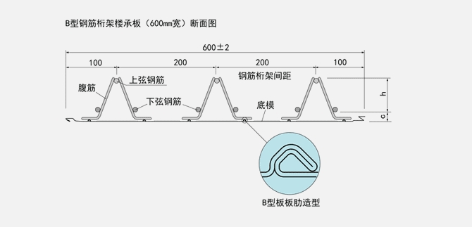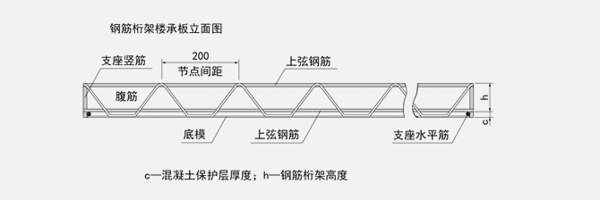 鋼筋桁架樓承板由上弦鋼筋、下弦鋼筋、腹桿鋼筋、底模、支座鋼筋構(gòu)成。